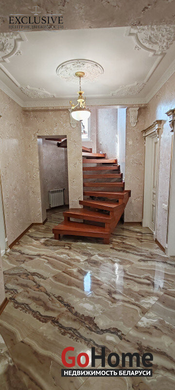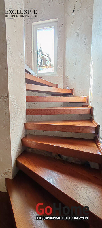 На этаж ведет дизайнерская лестница с мраморной колонной и дубовыми ступенями. Подъем по лестнице украшают цветные витражи исторических видов Гродно.