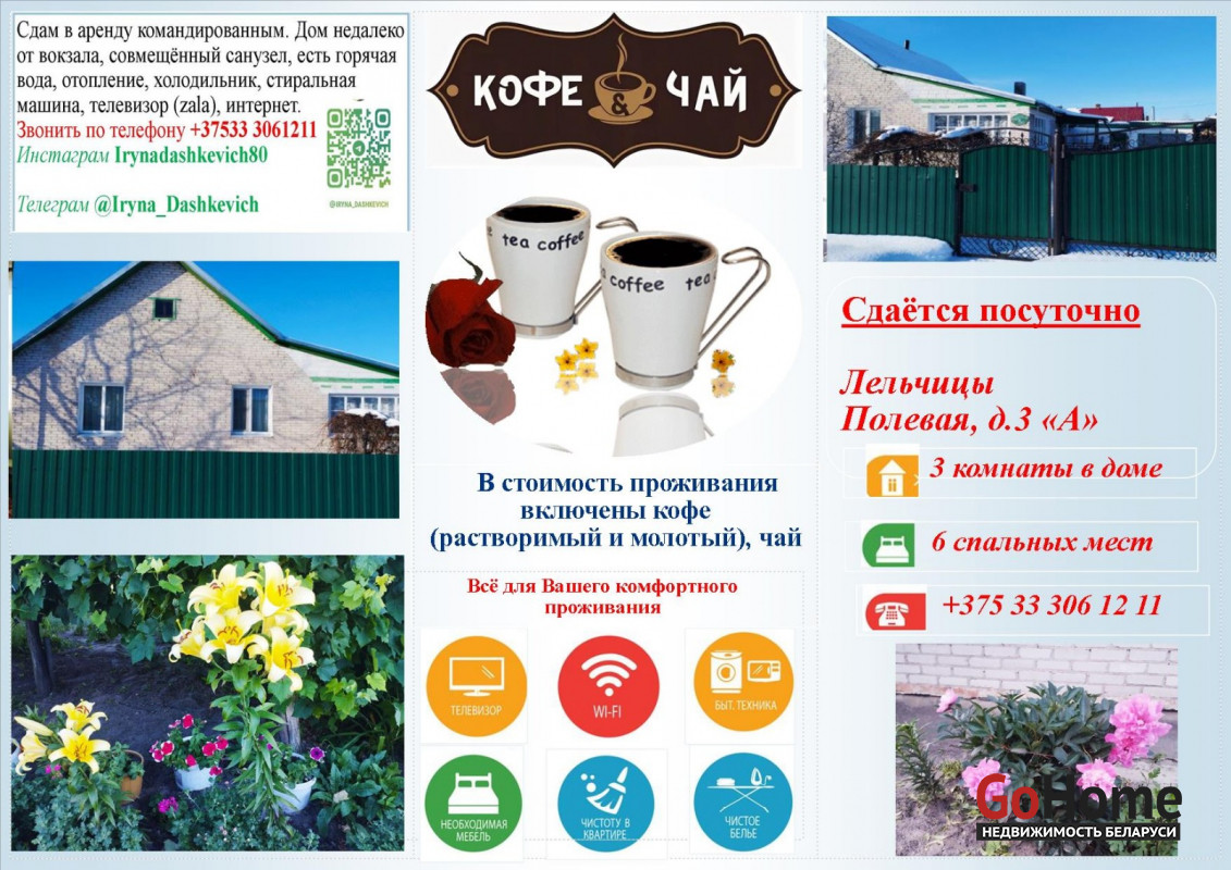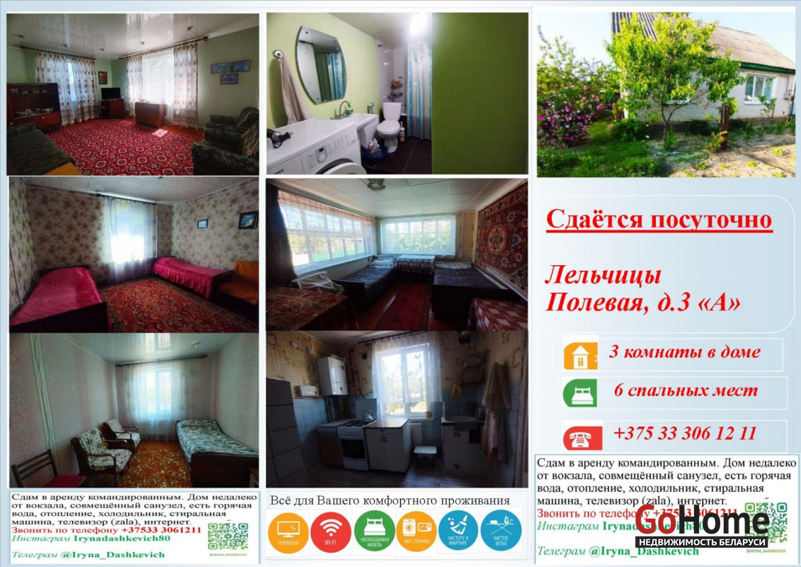 Сдам дом в Лельчицах на сутки для проживания. Командированным предоставляем необходимые документы. Дом находится в двух минутах ходьбы от автовокзала. Кофе, чай включены в стоимость. Есть всё необходимое для комфортного проживания: мебель, посуда, туалет, ванна, стиральная машина, микроволновка, утюг, электрочайник, телевизор (zala), интернет, горячая вода, газовое отопление в зимний период и межсезонье.