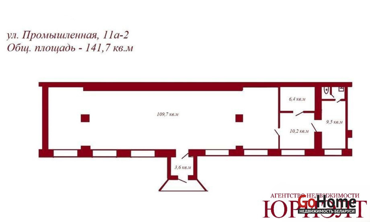 Общая площадь помещение (141.7 м²) состоит из общего зала (площадь 109,7 м²), комната-сейф (6,4 м²), две проходные комнаты (10,2 и 9,5 м²), с/у.