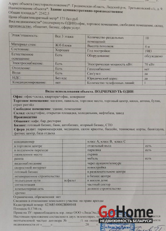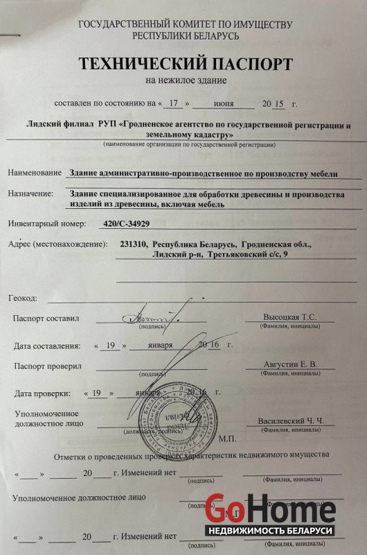 Здание из ж/б блоков представляет собой удобное и функциональное пространство по производству мебели, состоящее из 3-х этажей, общей площадью 2542,5 кв.м, площадь застройки 757 кв.м.,с залами и кабинетами, а также туалетом, душевой кабиной и комнатой для приема пищи. В здании хороший ремонт: наружная отделка-штукатурка, окраска; внутренняя отделка: частичная штукатурка, окраска, плиточная облицовка; оконные проёмы-двойные, деревянные, стеклопакеты, ПВХ-профиль (частично); дверные проёмы - ПВХ-профиль,щитовые, филёнчатые; перегородки-гипсобетонные, ж/б перекрытия. Полы- бетонные, плиточные, линолеум, дощатые. Отопление- локальная система, котёл на твёрдом топливе, водопровод, скважина с качественной питьевой водой, местная канализация. Электрическая мощность - 70кВт, газоснабжение- привозной газ.