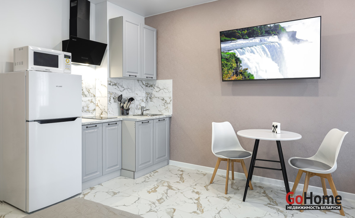 Квартира оборудована всей необходимой для комфортного проживания мебелью и бытовой техникой (большой телевизор, варочная панель, СВЧ-печь, холодильник, электрочайник, стиральная машина, утюг, фен).