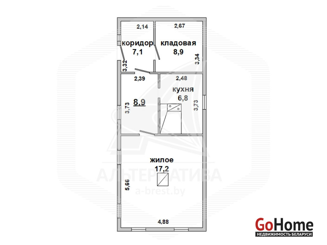 Жилой дом в Каменецком р-не. 1947 г.п. 1 этаж. Общ.СНБ - 58,8 кв.м, общ.- 58,8 кв.м, жил.- 36,0 кв.м, кух.- 6,8 кв.м. 2 комнаты, высота потолка - 2,36 м.