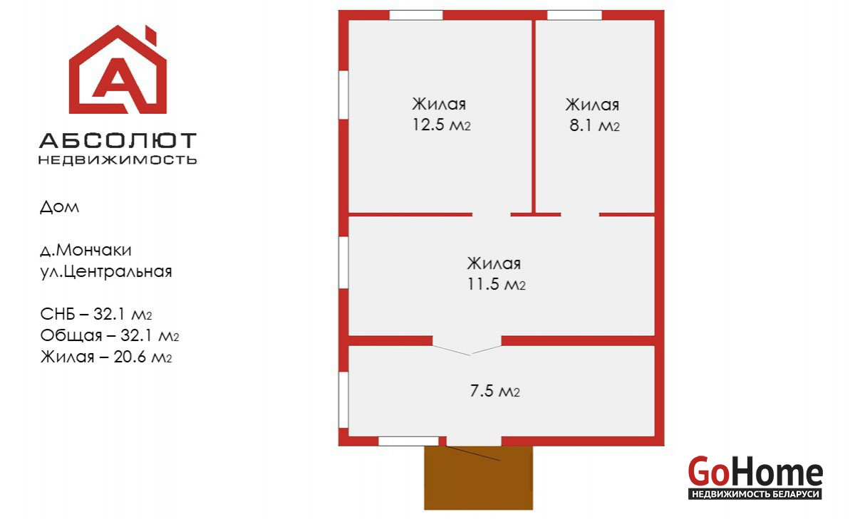 - общая площадь дома-32,1м2, жилая площадь- 20,6м2, площадь кухни-11,5м2;