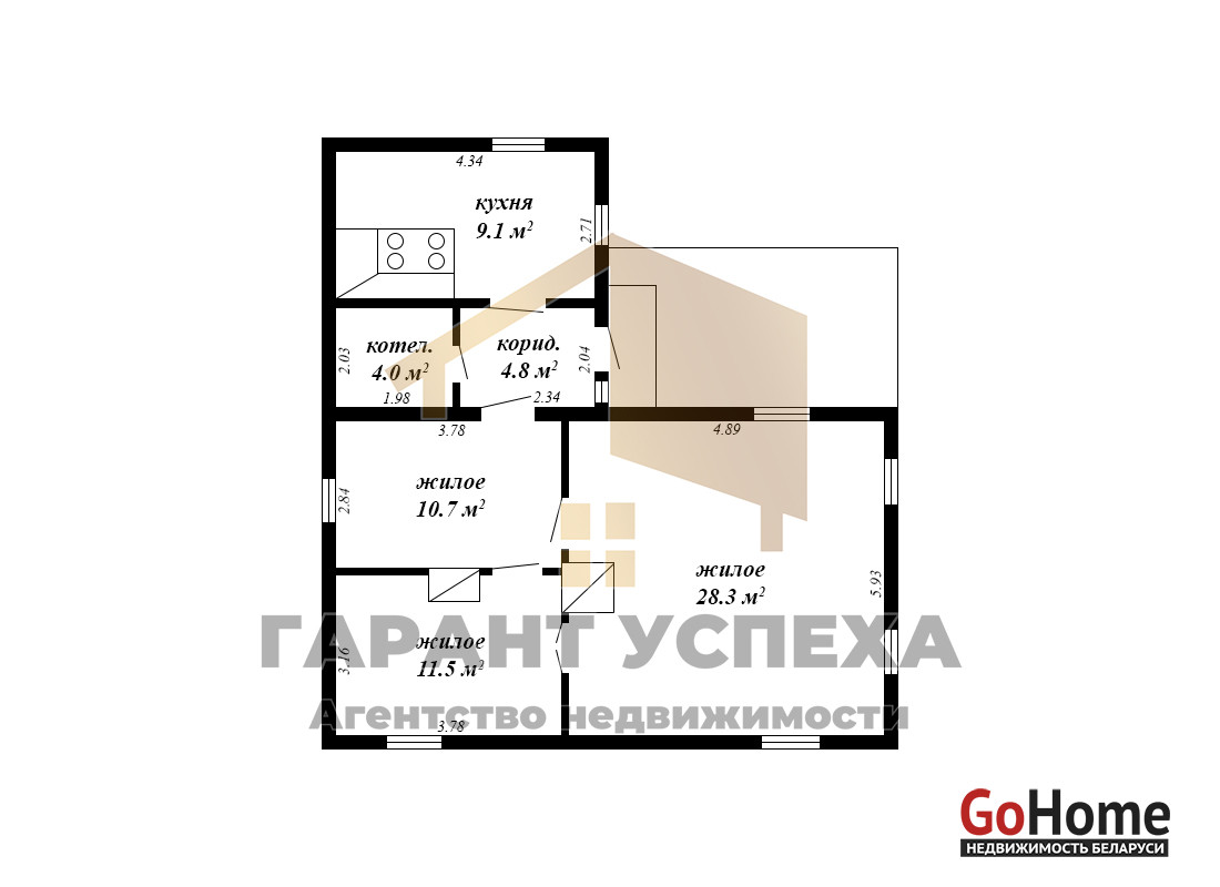 Общая площадь – 68,4 кв. м, жилая – 50,5 кв. м, кухня – 9,1 кв. м. Высота потолка – 2,6 м. Жилые комнаты 10,7/11,5/28,3 кв. м. Душ в доме. Туалет на улице.