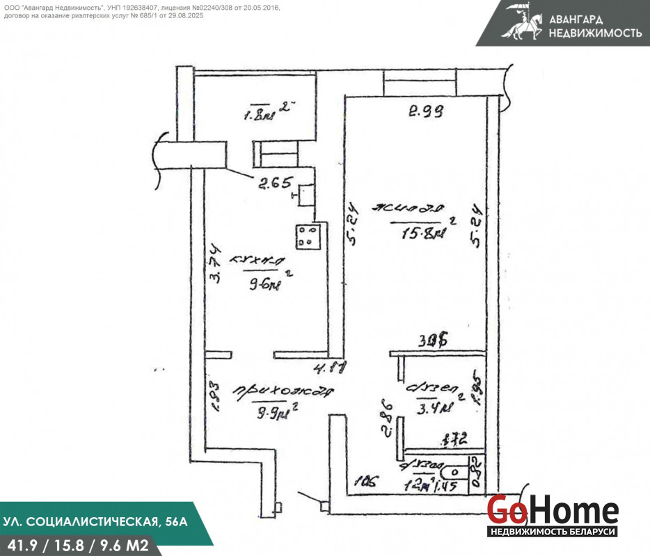Однокомнатная квартира с улучшенной планировкой. Площадь по СНБ 41,9м2 находится на пятом этаже из пяти. Есть технический этаж (полноценных 2 два пролета). Скатная крыша. Жилая комната правильной формы, площадью 15,8 м2. Просторный коридор площадью 9,9 м2. Кухня площадью 9,6 м2 с выходом на лоджию, площадью 3,6 м2.Совмещенный сан/узел. Высота потолка 2,55 м.
