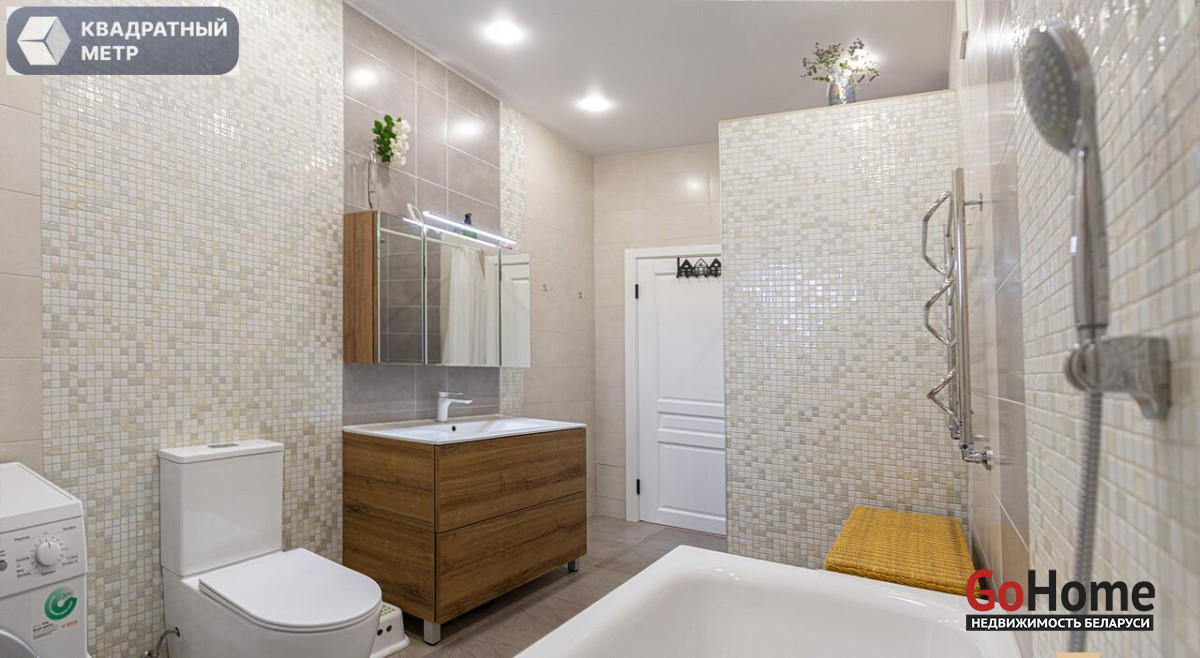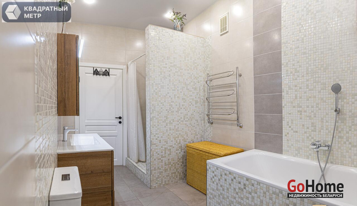 В ванной комнате уложена плитка мозайка, стальная ванная, сантехника финская.
