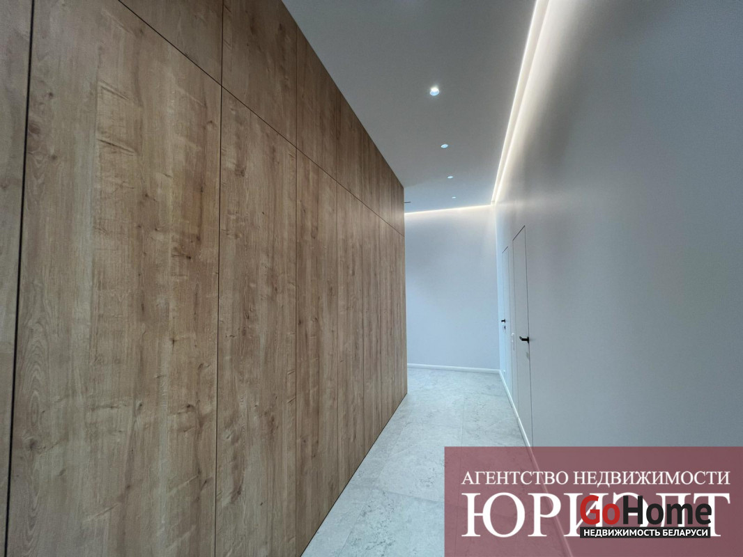 - Отделка: гипсокартонные потолки с парящими элементами и встроенными треками, окрашенные стены и частично стеновые панели Egger, полы из керамогранита и ламината.