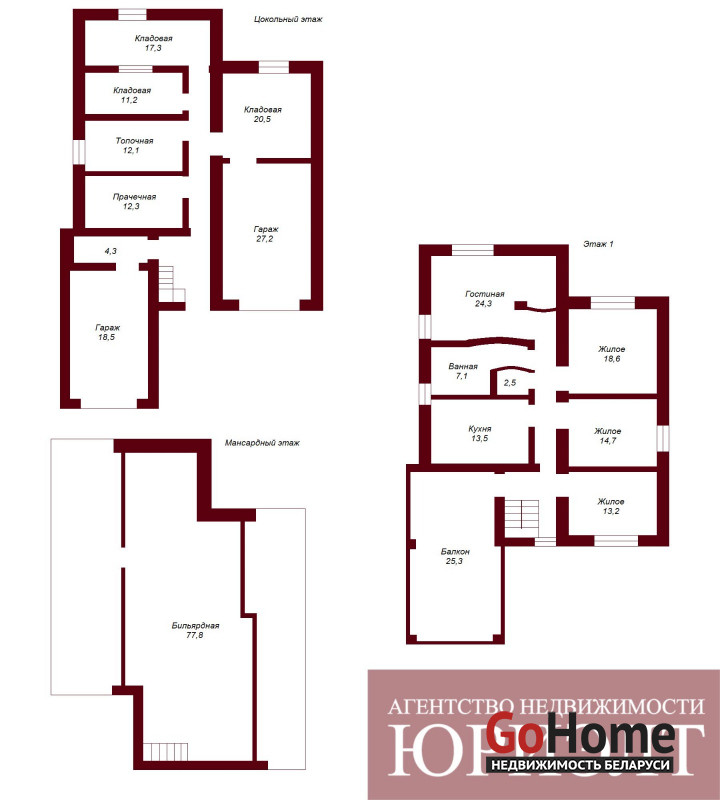 Общая площадь с цокольным и мансардным этажом - 339 м2/ жилая - 148.6 м2/ кухня - 13.5 м2. Имеется 5 жилых комнат, помещения хозяйственного назначения, просторная кухня и терраса, санузел, два гаража.