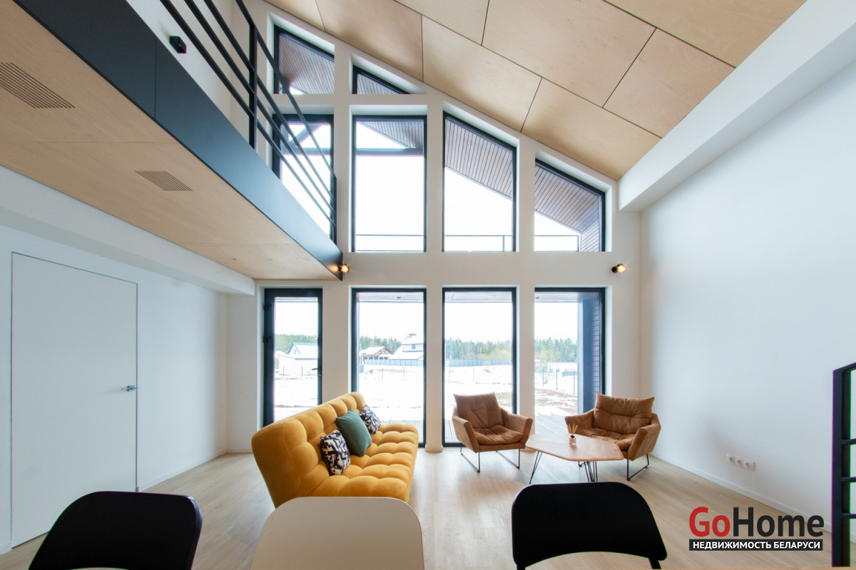 В гостиной второй свет на всю высоту дома со стеклянной стеной - 7 метров в высоту
