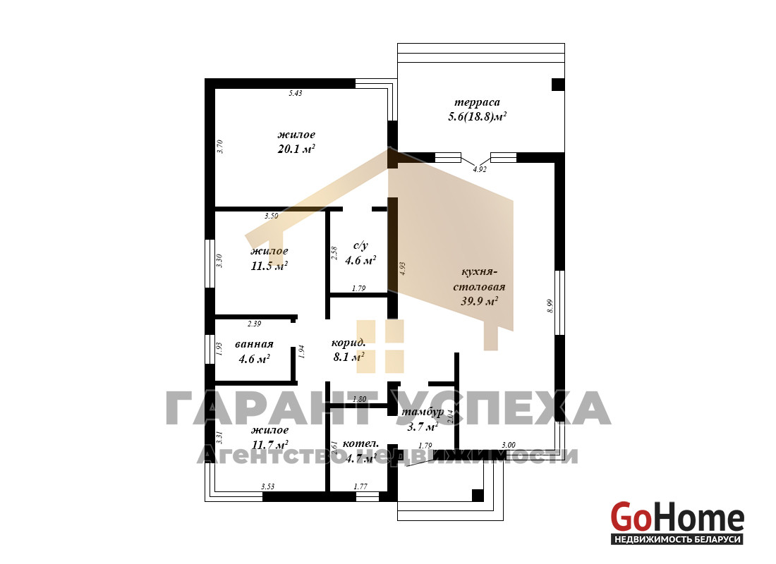 Общая площадь –128,8 кв. м, жилая – 73,4 кв. м, кухня – 9 кв. м, а вместе с гостиной образуют помещение в 40,1 кв. м. Высота потолка – 3 м, в гостиной 4 м. Три жилые комнаты 20,1/11,7/11,5 кв. м. Терраса 18,8 кв. м.
