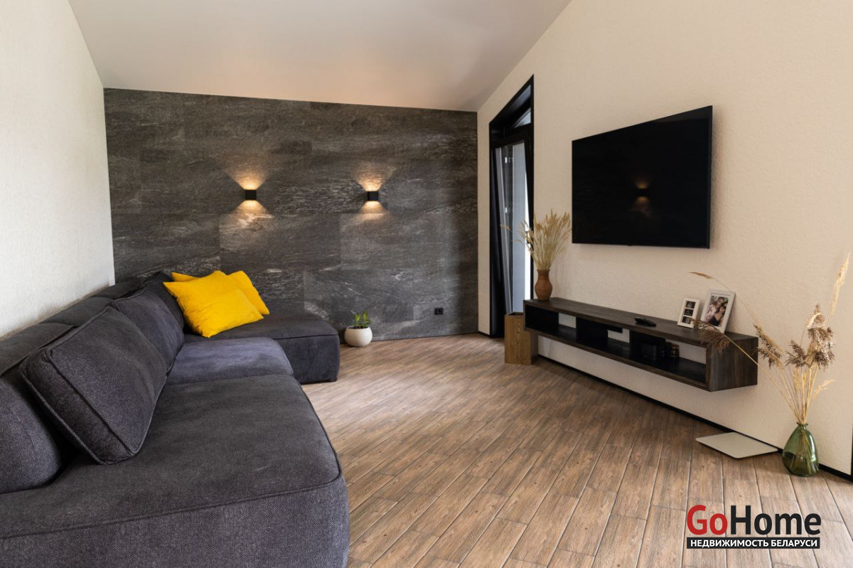 В зоне отдыха 4х метровый диван с телевизором LG 65 диагональю, под телевизором полка изготовления на заказ из дерева карагач.