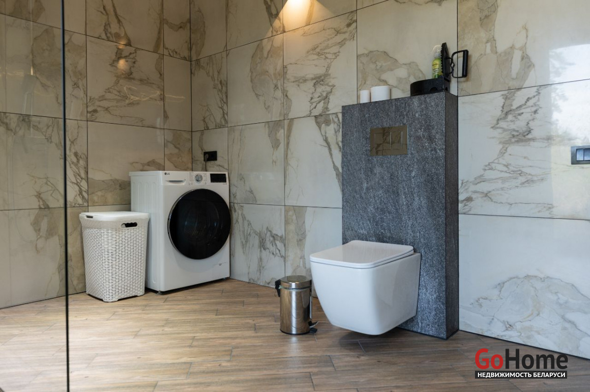 Тропический душ, обычный душ, кран, встроенный в стену полотенцесушитель, инсталляция TECE, монолитный стол, с ящиками для хранения, большое зеркало и люстра ручной работы, стиральная машинка LG.