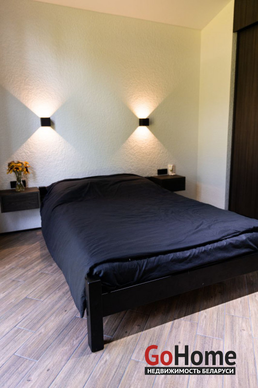 В хозяйкой спальне находится встраиваемая гардеробная, прикроватные полки и туалетный столик так же под заказ из дерева карагач.