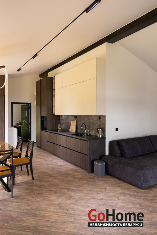 В гостиной находится кухня, на кухне встаиваемая техника европейских брендов, дизайнерский стол из дуба и эпоксидной смолы.