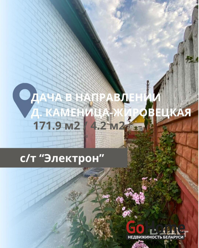 Подписывайтесь на наш instagram @ecrzby для удобного слежения за новыми актуальными объектами.Продается двухэтажная дача рядом с чертой города в садовом товариществе в направлении Каменица – Жировецкая,С/Т "Электрон". Место на карте указано примерно.Возможен обмен на 2-комнатную квартиру! Торг.Общая площадь дома 171,9 м.кв. На первом этаже располагаются: изолированная жилая комната с камином, современная кухня с действующей печью, душевая кабинка, гараж под бус высотой 2,70 и погребом, котельная оборудована котлом на твёрдом топливе и электрокотлом.На втором мансардном этаже расположены три изолированные жилые комнаты. На первом этаже заменены все окна на новые, на втором частично. Дом из блоков, обложен кирпичом, крыша- шифер. Газ централизованный подведен к дому, есть строительный проект на газоснабжение, электричество централизованное, отопление котёл, камин и печное, вода скважина. Земельный участок правильной формы 0,042 га, огорожен бетонным забором. На участке растут плодовые деревья и кустарники. На территории сарай, теплица и уборная. Залит фундамент под баню с готовой скважиной.Тихое, красивое место рядом с городом. Соседи спокойные и отзывчивые. Это выгодное и тихое место для комфортной жизни. В шаговой доступности остановка автобусов и маршруток, магазин «Евроопт». Недалеко шкоды, детские сады, магазины.