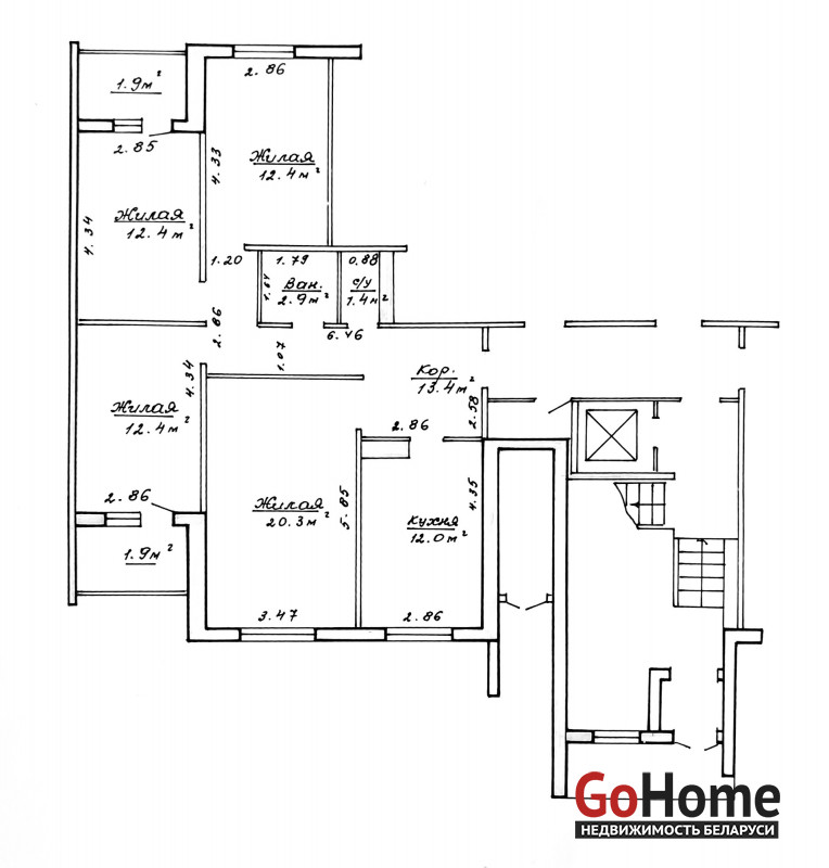 Площадь по СНБ 91 кв.м. Гостиная 20,0 м2 и три комнаты по 12,4 м2