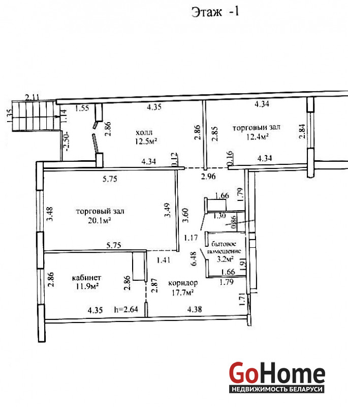 Общая площадь 78,9 м2, разделена на 3 помещения, санузел, бытовое помещение, большой холл.