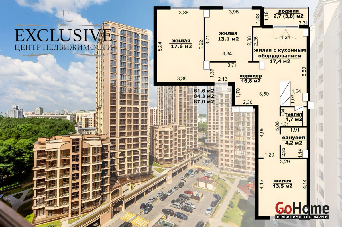 площадь по СНБ 87.0 м2 . Жилая 61.6 м2 . Отлично продуманная планировка включает три жилые комнаты и кухню- гостиную, из которой есть выход на лоджию . Лоджия застеклённая, пол с подогревом. В квартире сделан ремонт. Осталось только натянуть потолки. Напольное покрытие- ламинат. Зона кухни и с/ у облицованы керамогранитной плиткой . Установлены металлическая входная дверь и межкомнатные двери из закалённого стекла . Разведена электрика по дизайн- проекту.
