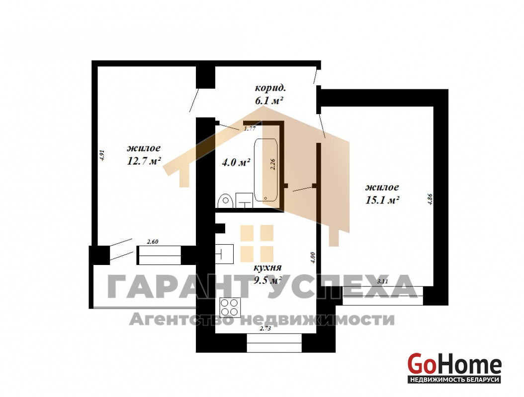 Квартира удобной планировки: две просторные комнаты 15,1 м² и 12,7 м², балкон с выходом из спальни, кухня - 9,5 м², коридор - 6,1 м², совмещенный санузел.