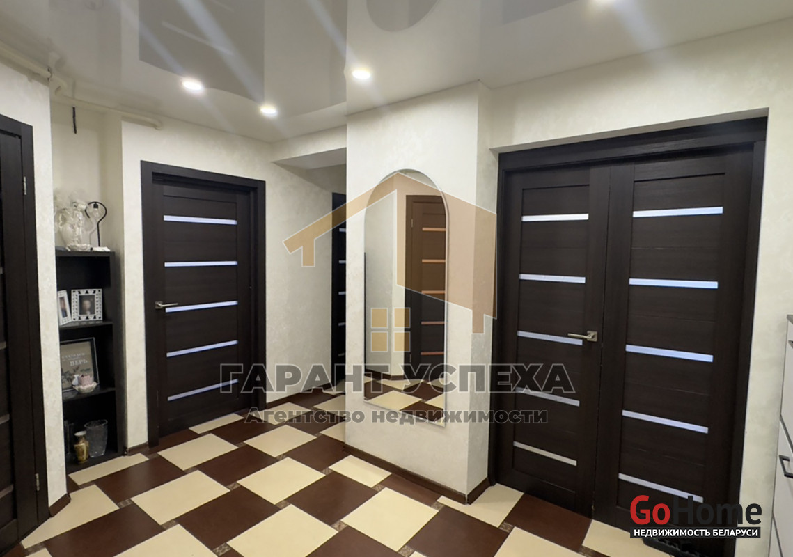 Входная дверь металлическая, межкомнатные двери нового образца, потолки в комнатах и гостиной натяжные, в кухне снежка, окна ПВХ, полы - ламинат, на кухне и в коридоре лежит плитка, в санузлах плитка современного образца. Имеется просторная кладовая для гардеробной.