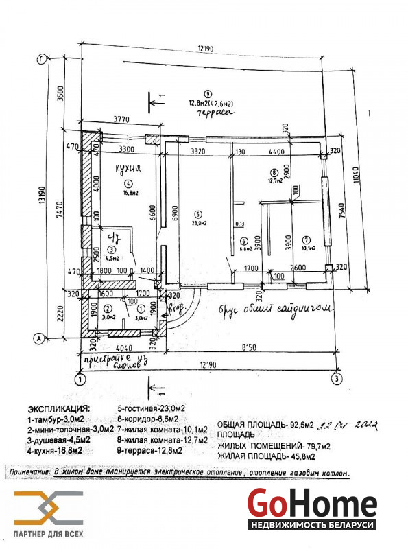 Общая площадь дома 92,5 м.кв. В доме три просторных комнаты общей площадью 45,8 м.кв., кухня площадью 16,8 м.кв. С обратной стороны дома выход на открытую террасу общей площадью 42.3 м.кв.