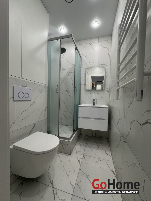 в ванной инсталляция, душевой уголок, подвесной умывальник, зеркало с подсветкой, потолочный диффузор с выведенной клавишей включения