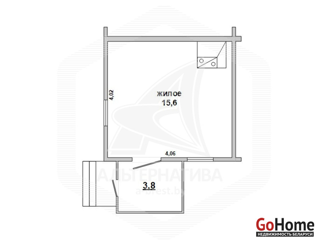 Квартира в блокированном жилом доме в г.Бресте. 1925 г.п. 1 этаж. Общ.СНБ - 19,4 кв.м, общ.- 19,4 кв.м, жил.- 15,6 кв.м, 1 комната, высота потолка - 2,74 м.