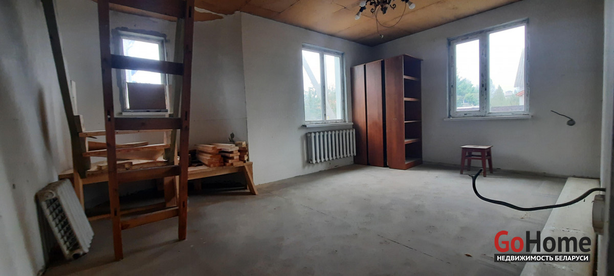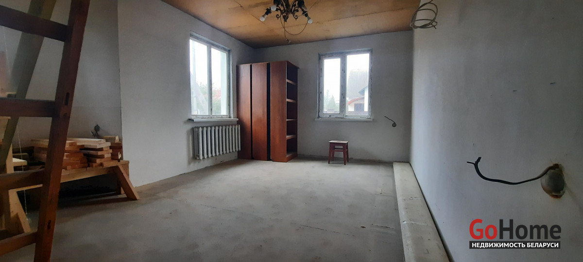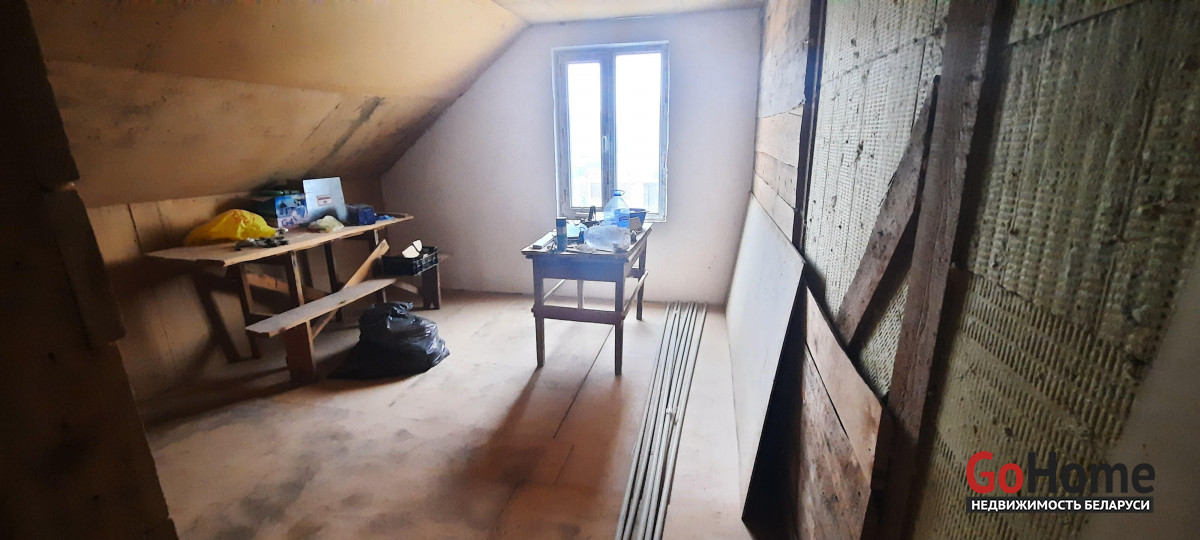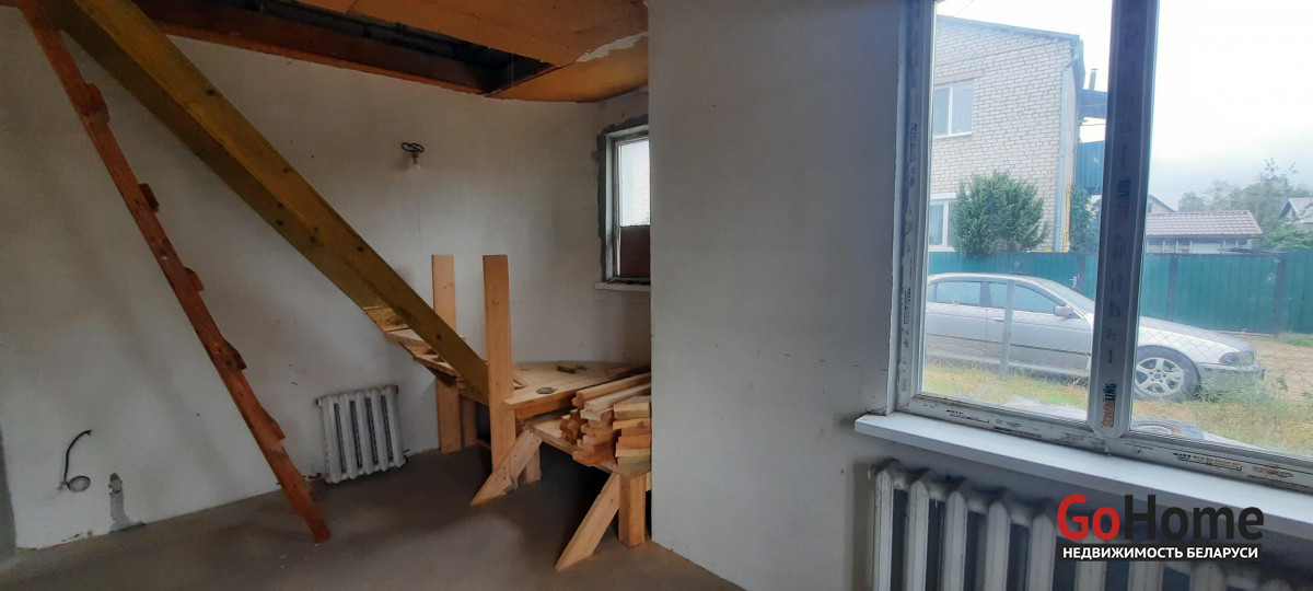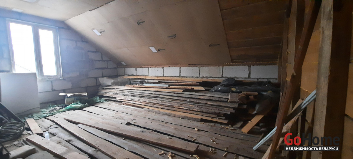 На первом этаже просторная гостиная, кухня 14м2, санузел. установлены стеклопакеты, выполнена стяжка, выровнены и прошпаклёваны стены, установлен новый двухконтурный газовый котел, закуплена керамическая плитка на кухню. На второй этаж ведет деревянная лестница (материалы закуплены), там расположены еще 3 комнаты. Потолки утеплены и подшиты дсп.