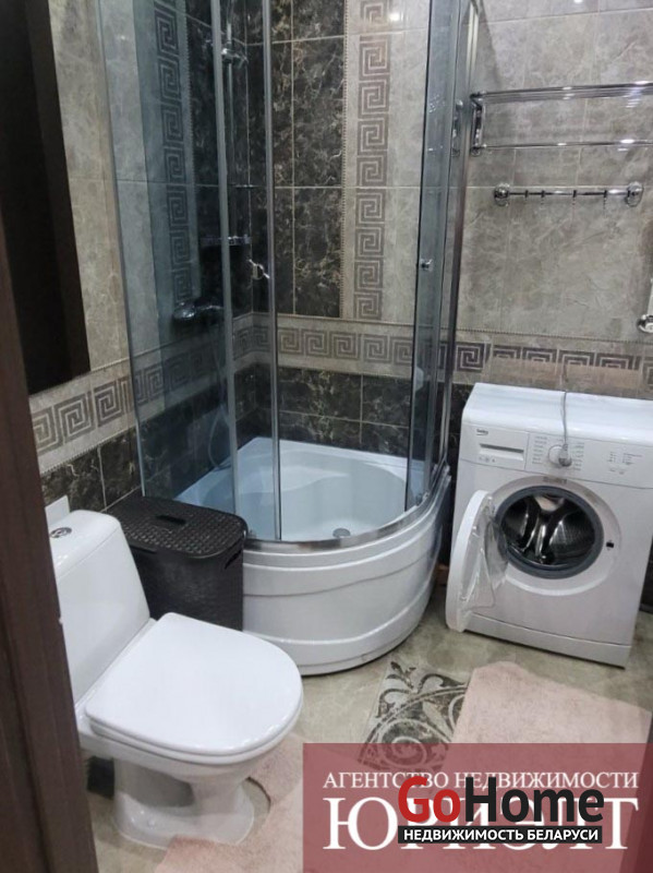 • Современный санузел (3,7 м²) в качественной плитке, с душевой кабиной и стиральной машиной.