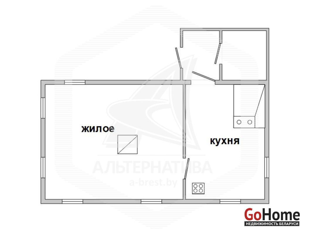 Жилой дом в Кобринском р-не. 1 этаж. Общ.СНБ - 43,4 кв.м, общ.- 43,4 кв.м, жил.- 29,4 кв.м, 1 комната.