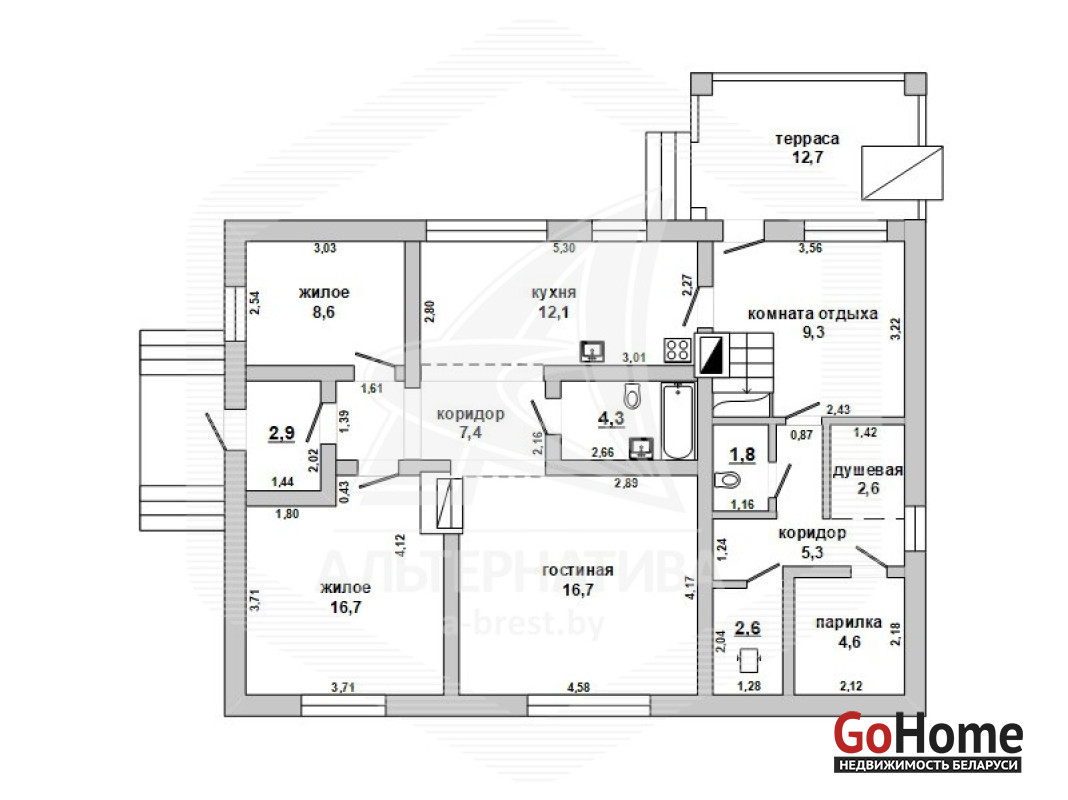 Жилой дом в Кобринском р-не. 2017 г.п. 1 этаж, мансарда. Общ.СНБ - 139,1 кв.м, общ.- 135,3 кв.м, жил.- 91,7 кв.м, кух.- 12,1 кв.м.