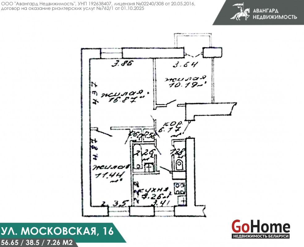 Квартира площадью 56,65м2, с двумя изолированными комнатами 11,44м2 и 10,19м2 и одной проходной комнатой площадью 16,87м2. Светлая кухня площадью 7,26 м2. Прихожая правильной формы, площадью 6,17 м2.Раздельный санузел, ванная площадью 2,23м2 и туалет 1,28м2. Квартира на 4-ом этаже из 4. Окна выходят на две стороны. Есть застекленный балкон. Скатная крыша является плюсом. В подъезде 6 квартир (на этаже две квартиры).