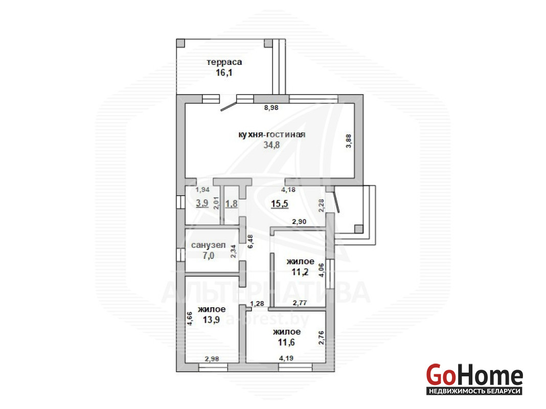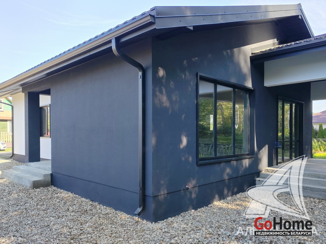 Дачный дом жилого типа в Брестском р-не. 2025 г.п. 1 этаж. Общ.СНБ - 120,6 кв.м, общ.- 104,5 кв.м, жил.- 71,5 кв.м, кух.- 34,8 кв.м. 3 комнаты.