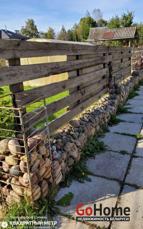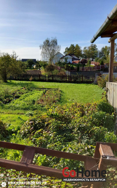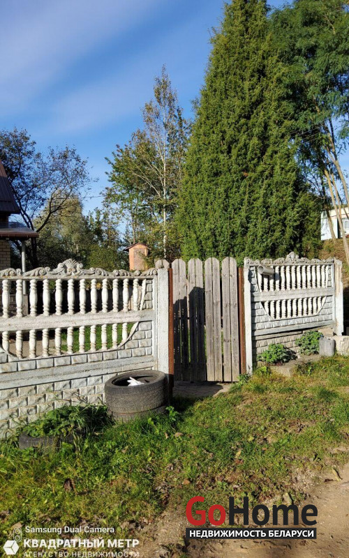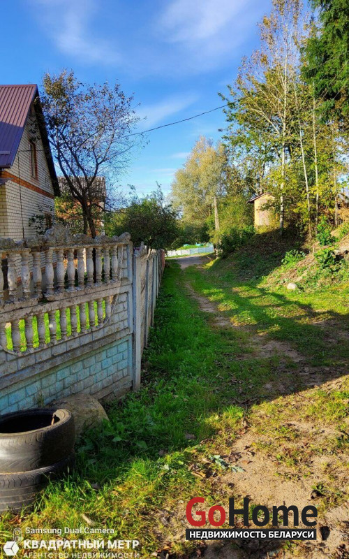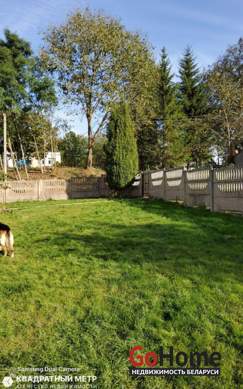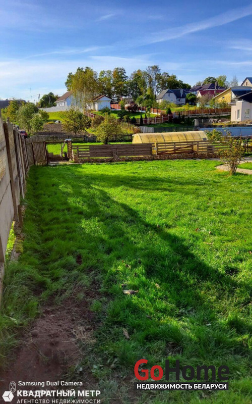 Участок солнечный, имеет правильную форму, немного под наклоном.По контуру огорожен.Выделена зона под огород, есть парник из поликарбоната.Газон. Плитка. Декоративные кусты, плодовые деревья.Просторная бесседка из дерева.