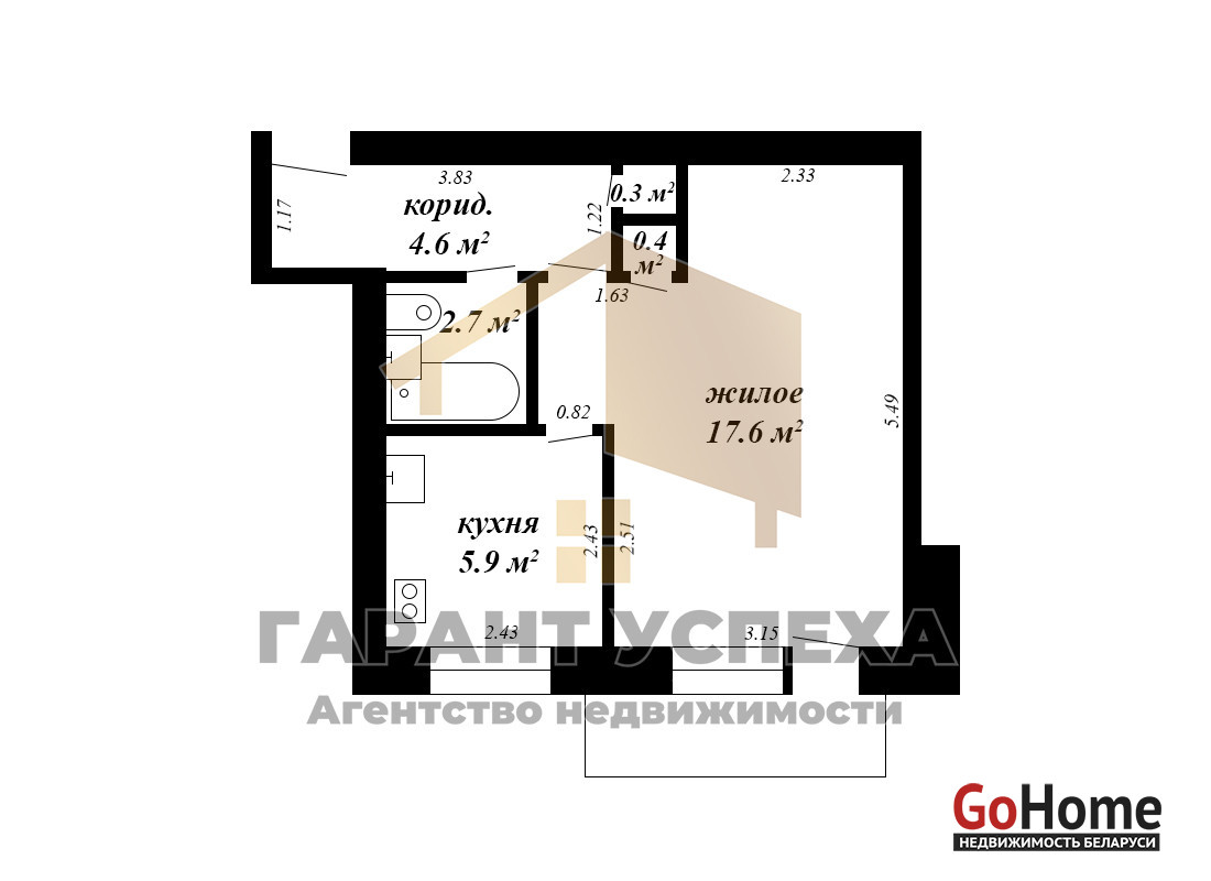Общая площадь квартиры составляет 31,5 м² (по СНБ - 32,3 м²), жилая - 17,6 м², кухня - 5,9 м². Санузел совмещённый - 2,7 м².