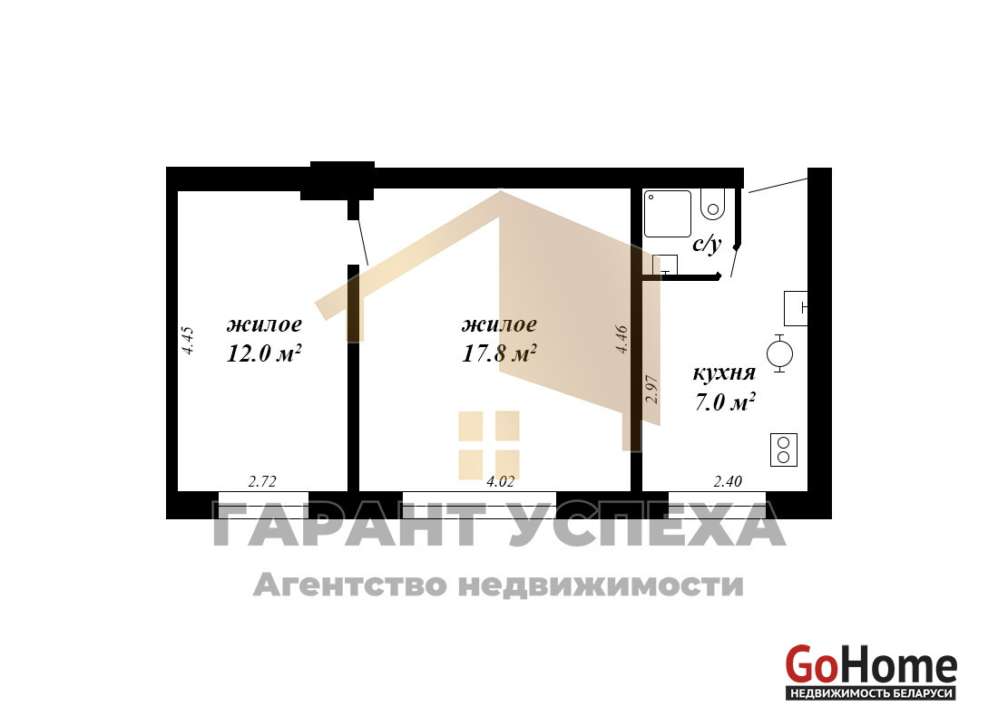 Рациональная смежная планировка, где зал 17,8 кв.м. является проходной комнатой, спальня - 12 кв.м, кухня - 7 кв.м, совмещённый санузел, коридор.