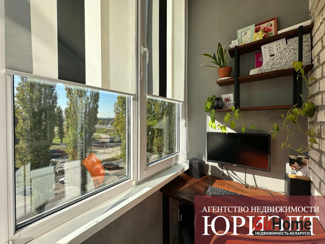 — проходной зал 15 м² с выходом на открытый балкон и утеплённый балкон с выходом из спальни, где обустроена уютная рабочая зона с видом на реку.