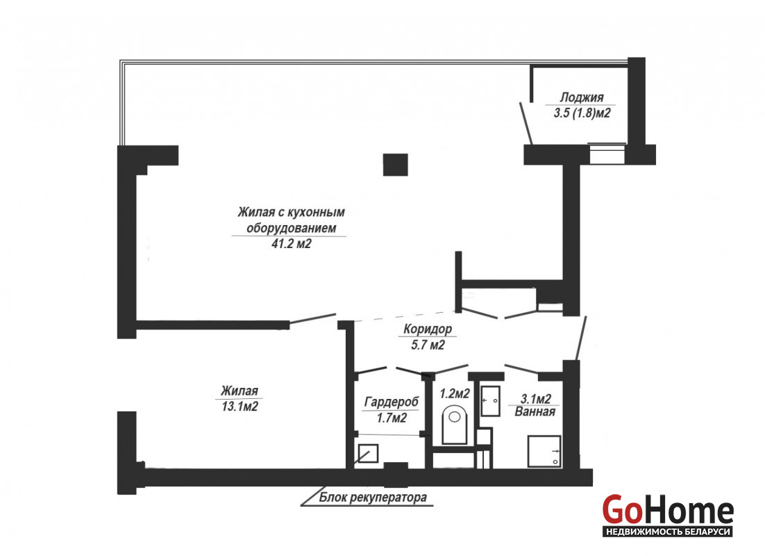 Планировка: 2 комнаты (спальня и гостиная с кухонной зоной), раздельный санузел, лоджия 3,5 м², гардеробная.
