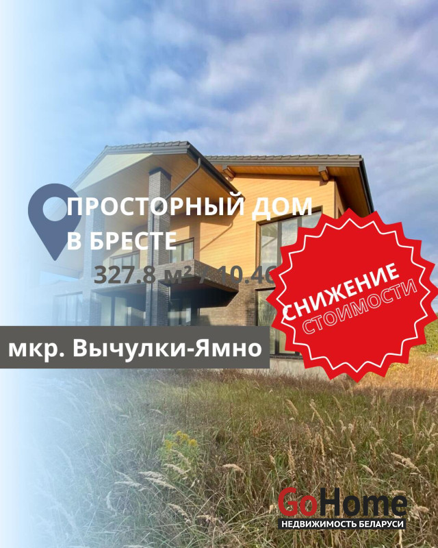 Подписывайтесь на наш instagram @ecrzby для удобного слежения за новыми актуальными объектами.В продаже современный коттедж под чистовую отделку в восточной части г. Бреста, в мкр. Вычулки-Ямно.Дом двухэтажный из газосиликатных блоков, перекрытие монолитное. Фасадная часть отделана планкеном/клинкерным кирпичом (Roben). Крыша покрыта натуральной черепицей (Roben). Участок площадью 10,49 сот. ровный, правильной формы.Общая площадь дома 327,8 м кв, жилая 197,7 м кв, кухня-столовая 37,3 м кв. Отличная планировка. На первом этаже располагается просторный кабинет, кухня-столовая с выходом на террасу, гостиная, хамам с комнатой отдыха, гардероб, санузел и техническое помещение с европейской техникой для обслуживания дома. Действующий камин.На втором этаже 4 спальни, одна из них мастер-спальня (со своим санузлом, гардеробной и выходом на террасу). Кроме того, на этаже имеется еще один санузел. Двери и окна выполнены из алюминиевого профиля. Под всеми окнами по периметру дома расположены конвекторы.В доме разведена трасса для приточно-вытяжной системы вентиляции с рекуперацией воздуха. На всей зоне первого этажа теплый пол. Установлены несколько точек для вывода кондиционеров. По дому разведены электрика и сантехника. Вместительная кладовая комната с отдельным входом с улицы. Навес на две машины.