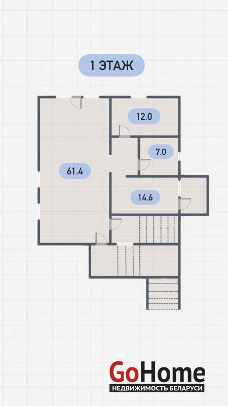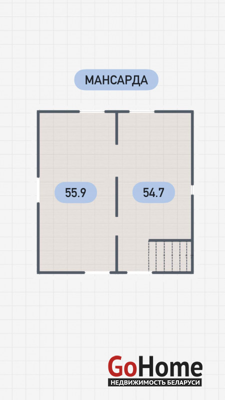 На первом этаже расположены три комнаты (61,4 кв.м, 12,0 кв.м), кухня площадью 14,6 кв.м с выходом на балкон и совмещенный санузел на 7,0 кв.м. Мансардный этаж включает две жилые комнаты площадью 55,9 и 54,7 кв.м. Цокольный этаж состоит из гаража и топочной общей площадью 98,4 кв.м с высотой потолков 2,58 м.