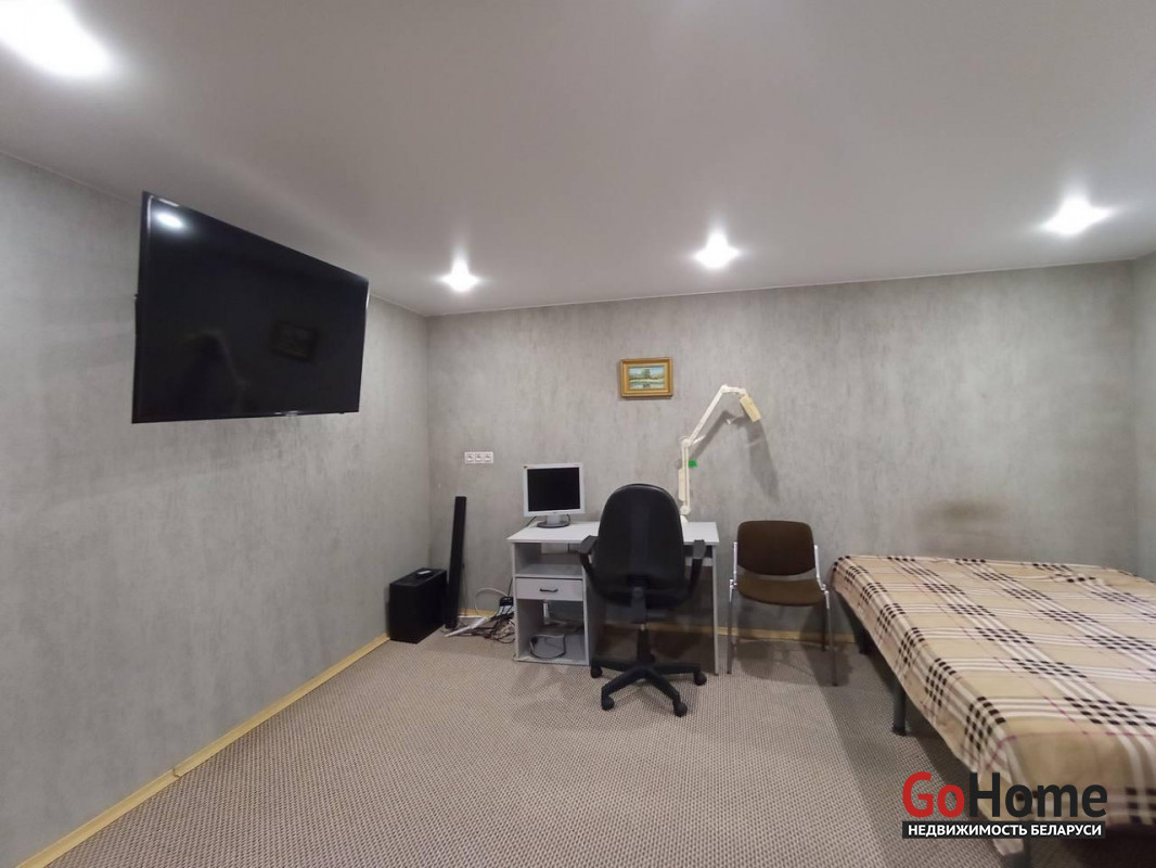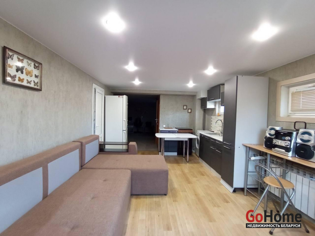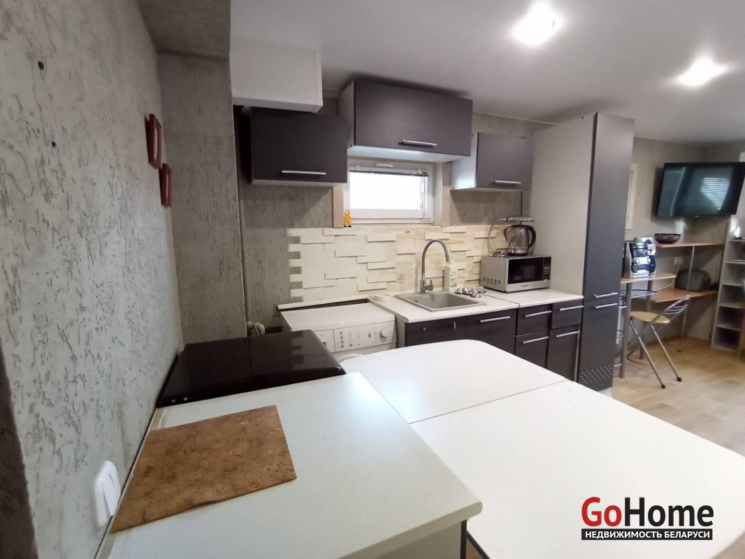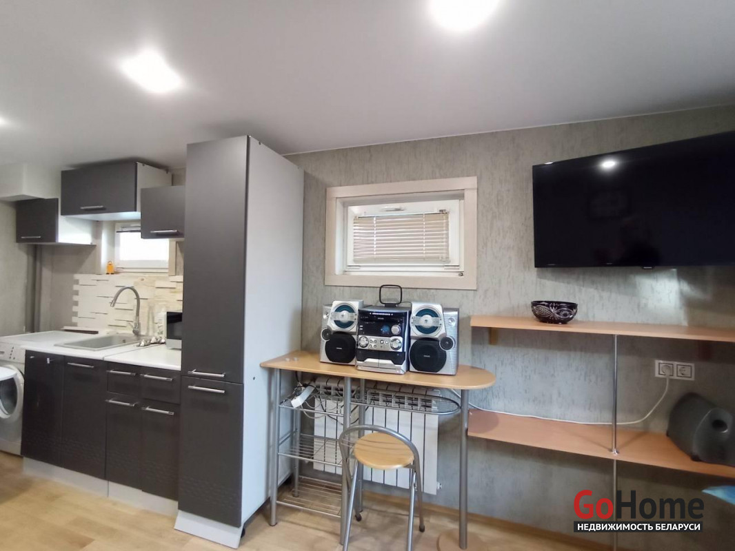 Кухня с гостиной с большим раскладывающимся диваном полностью оборудована всей бытовой техникой: холодильник, плита, свч, стиральная машина, телевизор, музыкальный центр. Во всей квартире окна ПВХ, жалюзи. Натяжные потолки, встроенные светильники.Комната с двухспальной кроватью, рабочим столом, телевизором, и шкафом. Ванна с душевой кабиной, и шкаф с умывальником. Санузел отделан сайдингом.Есть дополнительная кладовая комната. Входная дверь сразу с выходом на просторный участок, с зоной отдыха для барбекю, детской площадкой.Рядом с домом остановка, и много магазинов.