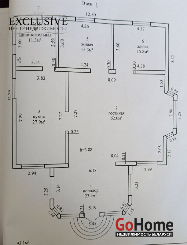 Дом из газосиликатных блоков на высоком ленточном фундаменте 2024 года постройки. Перекрытия деревянные, крыша металлочерепица, полы бетонные, большие окна ПВХ, дверь металлическая. Центральная вода и канализация, электричество, газовое отопление. В эксплуатацию введён первый этаж общей площадью 156,2 кв.м. Жилая площадь 93,1 кв.м. Коридор 23.9 кв.м, гостиная 62 кв.м., кухня 27, 9 кв.м. -отапливаются тёплыми полами. Жилые комнаты 15,3 и 15, 8 м.кв., мини-котельная с санузлом 11,3 кв.м.