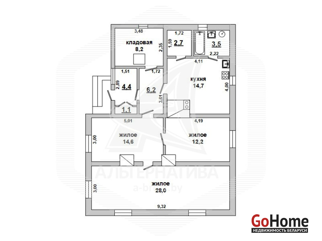 Жилой дом в Кобринском р-не. 1980 г.п. 1 этаж. Общ.СНБ - 95,6 кв.м, общ.- 95,6 кв.м, жил.- 54,8 кв.м, кух.- 14,7 кв.м. 3 комнаты, высота потолка - 2,70 м.