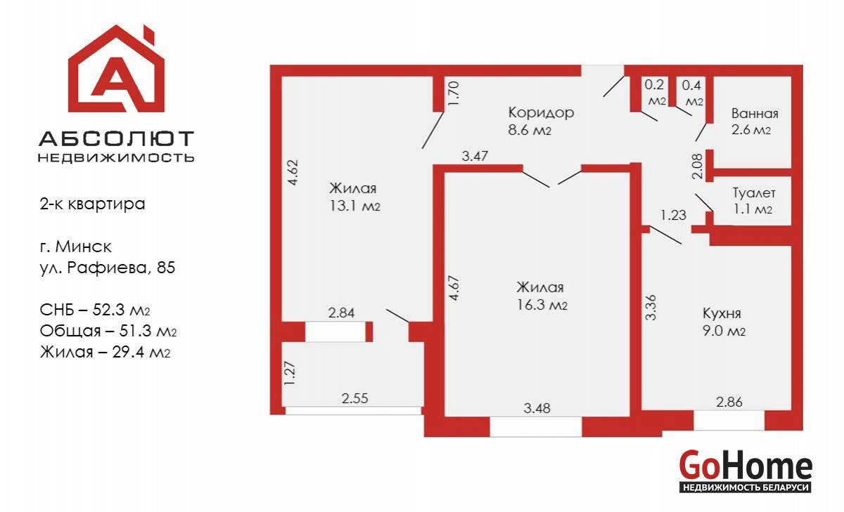 Общая площадь квартиры – 51, 3 м.кв, жилая – 29,4 м.кв, кухня – 9,0 м.кв, потолки – 2,61м.