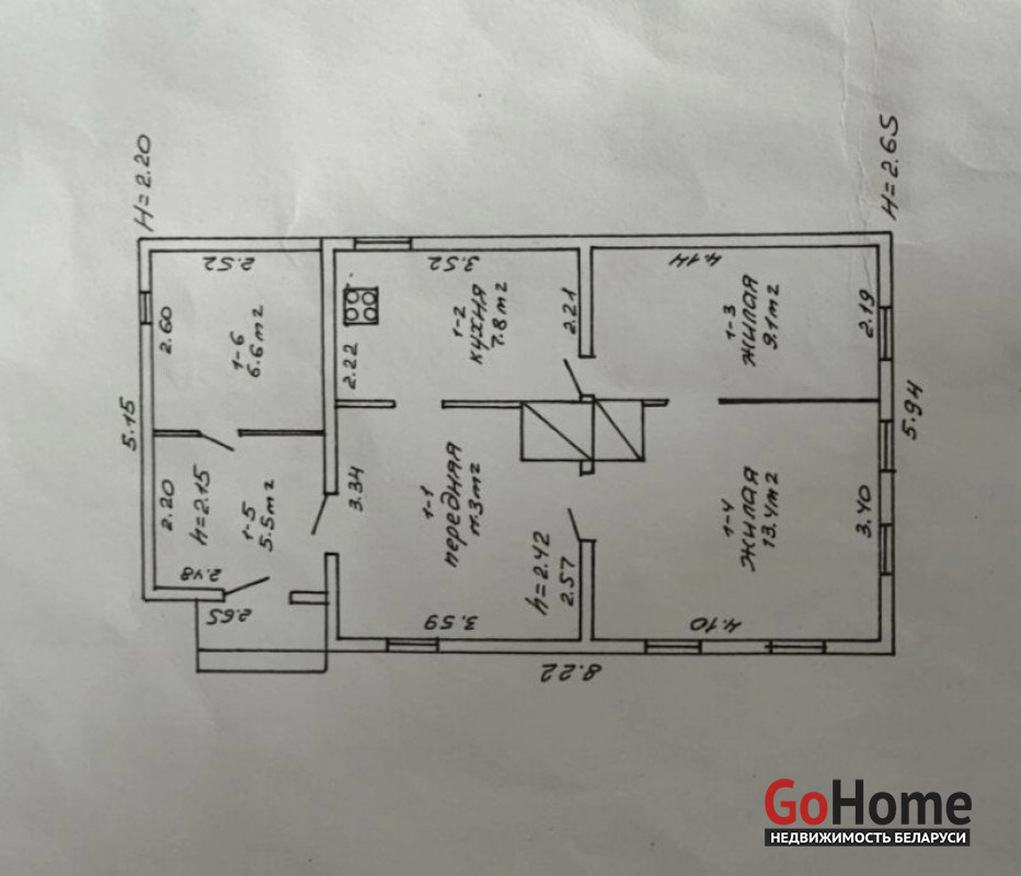Площадь дома по СНБ (с сенями и кладовой) - 53,7м2. Общая площадь дома - 41,6м2, жилая - 22,5м2.