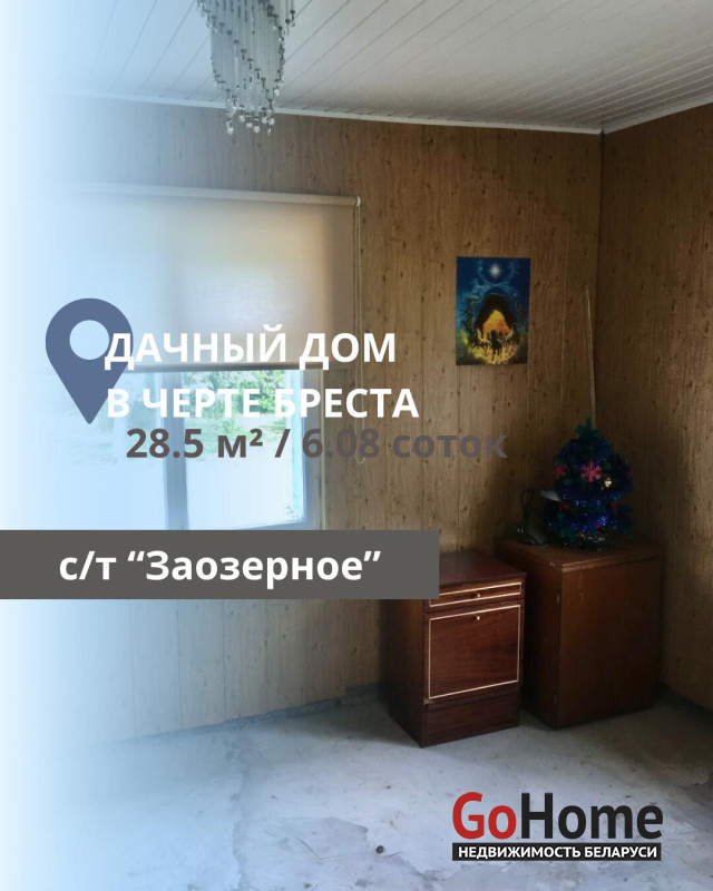 В продаже уютная дача в садовом товариществе "Заозерное" (Брест). Улица указана ориентировочно.Общая площадь 28,5 м.кв. Год постройки -2008. Дом из газосиликатного блока, крыша шифер. Входная дверь- металлическая. Окна ПВХ.Сделан свежий ремонт, обустроен с/у, душевая кабина, внутренняя отделка - панели МДФ и ПВХ. Электричество в доме. Вода - скважина.Канализация септик.Газ возле участка. Центральная вода и канализация - скоро ввод в эксплуатацию. Конечная маршрутки №17. Участок 6,08 сот. правильной формы, огорожен.Отличное место для строительства вашего дома и отдыха.