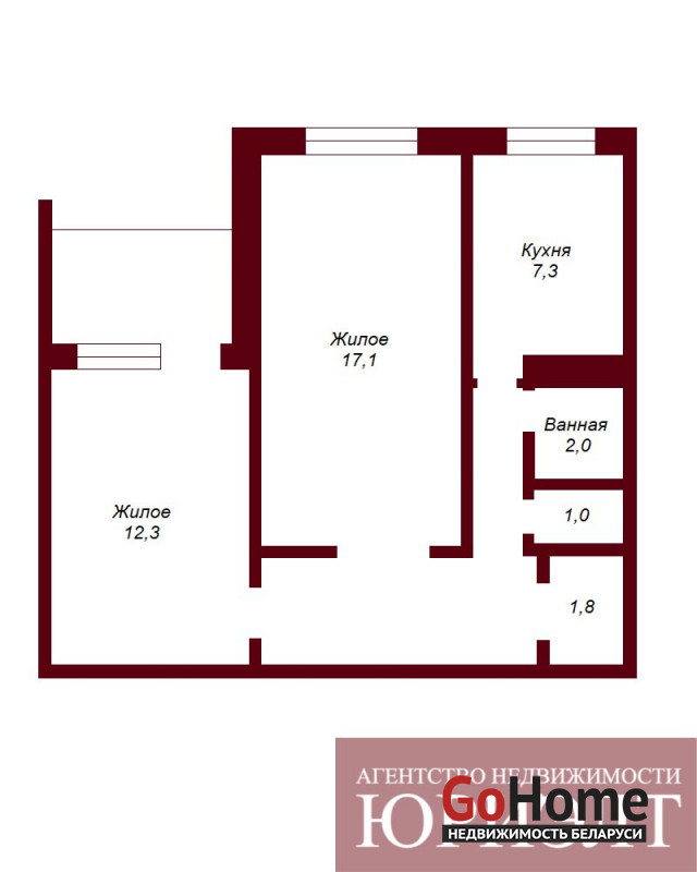 Общая площадь составляет 51,7 м², жилая - 29,4 м², кухня - 7,3 м².
