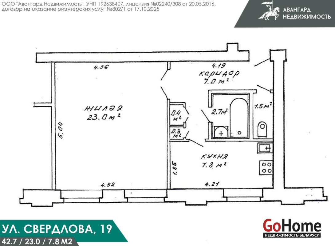 Площади: общая – 42.7 м2/ жилая – 23 м2/ кухня – 7.8 м2
