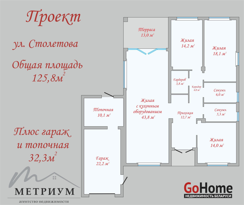 Общая площадь — 125,8 м2, плюс гараж 22,2 м2 и топочная.