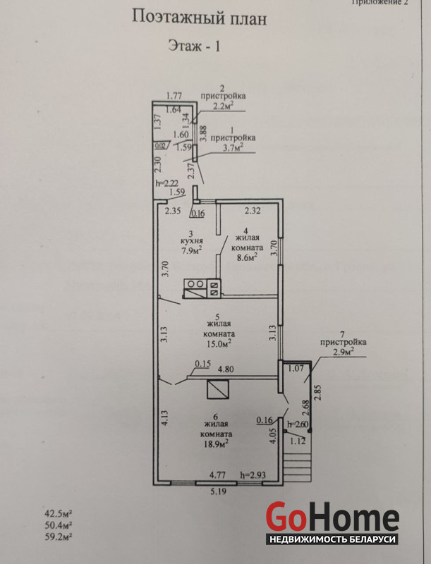 Дом представляет собой одноэтажное строение 1909 года постройки, общей площадью по СНБ – 59,2 кв.м., общей площадью – 50.4 кв.м., жилой площадью – 42,5 кв.м.